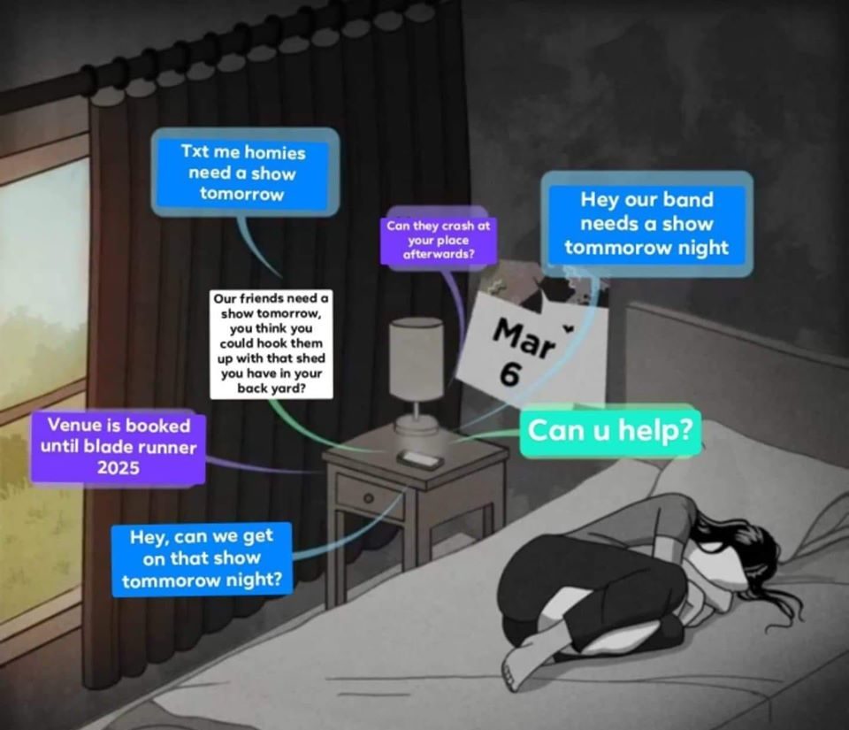 "There are so many incredible DIY promoters, venues and collectives in the country and this Facebook community page of almost 30,000 people is incredibly helpful in connecting them. All you have to do is post something that looks like: "Hi, I'm _name_, and I am booking some dates for _band name(s)_. We need help with the dates below. Will happily return the favor in _hometown_! DATE 1 - [tentative location] DATE 2 - [tentative location] DATE 3 - [tentative location] [insert music links and relevant social media links]" and you'll get in touch with other promoters, DIY spaces, bands, and musicians who will act as promoters and swap shows with you."