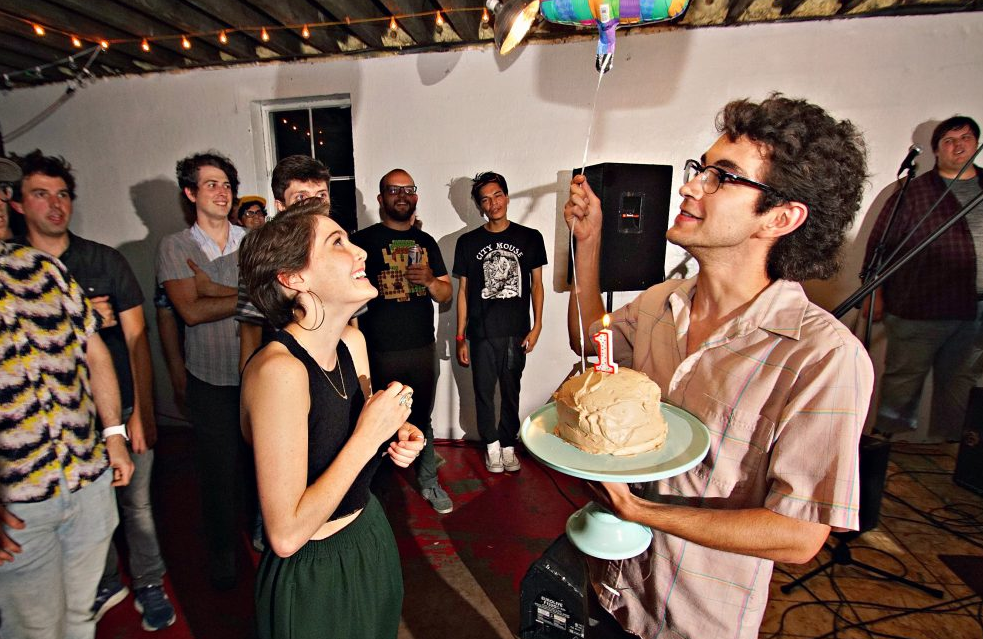 Photo of Paige Batson on the left receiving a birthday cake at the One Year Show on August 23rd, 2018 with Paul Cherry, ACBs, Dreamgirl, and Fullbloods