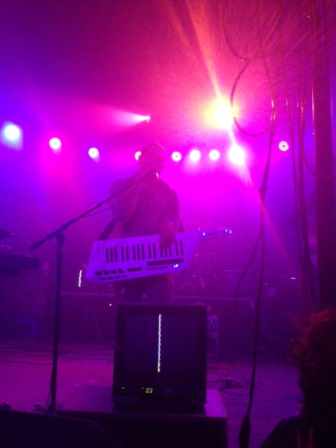 My vantage point directly in front of Dan Deacon provided optimal grooving-out space (I put in a good hour of intense dancing, or rather primal jumping movements) and also allowed me to see how intricate Deacon’s actions are when layering his complex digital soundscapes. He covers all of his gear in striped neon pink, green, yellow, and blue tape, creating a space where even electronic music geeks such as myself would not be distracted by the kind of equipment he was using. Every time he turned a knob, or pressed a new button on his “table of mysteries,” sounds would blast out of the speakers that had so much texture and were so tangible, it felt as though I could touch them and put them in my pocket to take home.