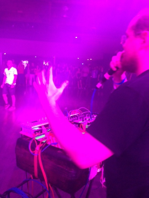Minutes after Jetpacks and Laserguns exited the stage, Dan Deacon began setting up his table of neon-tape-covered equipment in the middle of the floor - yes, the middle of the floor, not the stage! It was clear from the beginning of Deacon’s set that he is not only a musician, but also something of a comedian, a sort of goofily unhinged summer camp counselor bursting with ideas for wacky, feel-good social experiments in which everyone is encouraged to participate. He began the show with a rant about the future, aliens, and dualism, and after a mind-blowing first song, he ordered the audience to gather on either side of the room, wait until the drum and bass drop, and then race back to the middle in order to high- five as many people as possible. Quirky activities like these have long been built into Deacon's sets as a means of disrupting typically passive audiences, and its nearly impossible not to smile and play along.