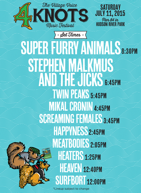 The 5th annual 4Knots Music Festival approaches. Held Saturday, July 11 at Pier 84, this year brings performances from Welsh psych-stars Super Furry Animals and Portland rockers Stephen Malkmus and the Jicks along with: Twin Peaks, Mikal Cronin, Screaming Females, Happyness, Meatbodies, Heaters, Heaven, and Surfbort. Thankfully nothing overlaps so you can see them all 'cause they all rock. I just picked the top three to talk about that at this point in my existence made me feel something.