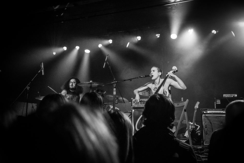Cincinnati rock duo Lung sound HUGE. With only an electric cello, drums and vocals, they have a sludgy post-rock sound that could fit inside a stadium. Formed in 2016 by Kate Wakefield on cello/vocals and Daisy Caplan on drums, the duo met after Daisy's former band Babe Rage had Kate collaborate with them during a residency. They have since played over 500 shows in the US and toured Europe. In that short period they've made a name for themselves sharing the stage with bands like Screaming Females, Fucked Up, Priests, Downtown Boys, Shellshag and more. Their sophomore record All The Kings Horses was released in fall of 2018 on Sofaburn Records, and they're currently working on their third album.