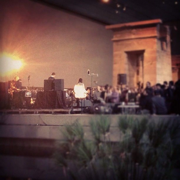 After thoroughly enjoying last summer's set at Webster Hall, I was pumped to see Liars not once but twice this past weekend. The first show was in the Met's Temple of Dendur, which is about as epic as a setting gets. The band literally played amongst the ruins of the monument, built in 15 BC by Petronius, Roman governor of Egypt and relocated to the museum's Sackler Wing in 1978 after being gifted to the United States to save it from flooding created by the Aswan Dam. The acoustics were either awesome or jarringly echoic depending on where you were standing, and where you were standing depended on gallery officials adhering to fire codes, but hey. The trippy projections flashing behind Angus Andrew and company were probably more than twenty feet wide and plenty enthralling if your vantage point was less-than ideal for watching the band.