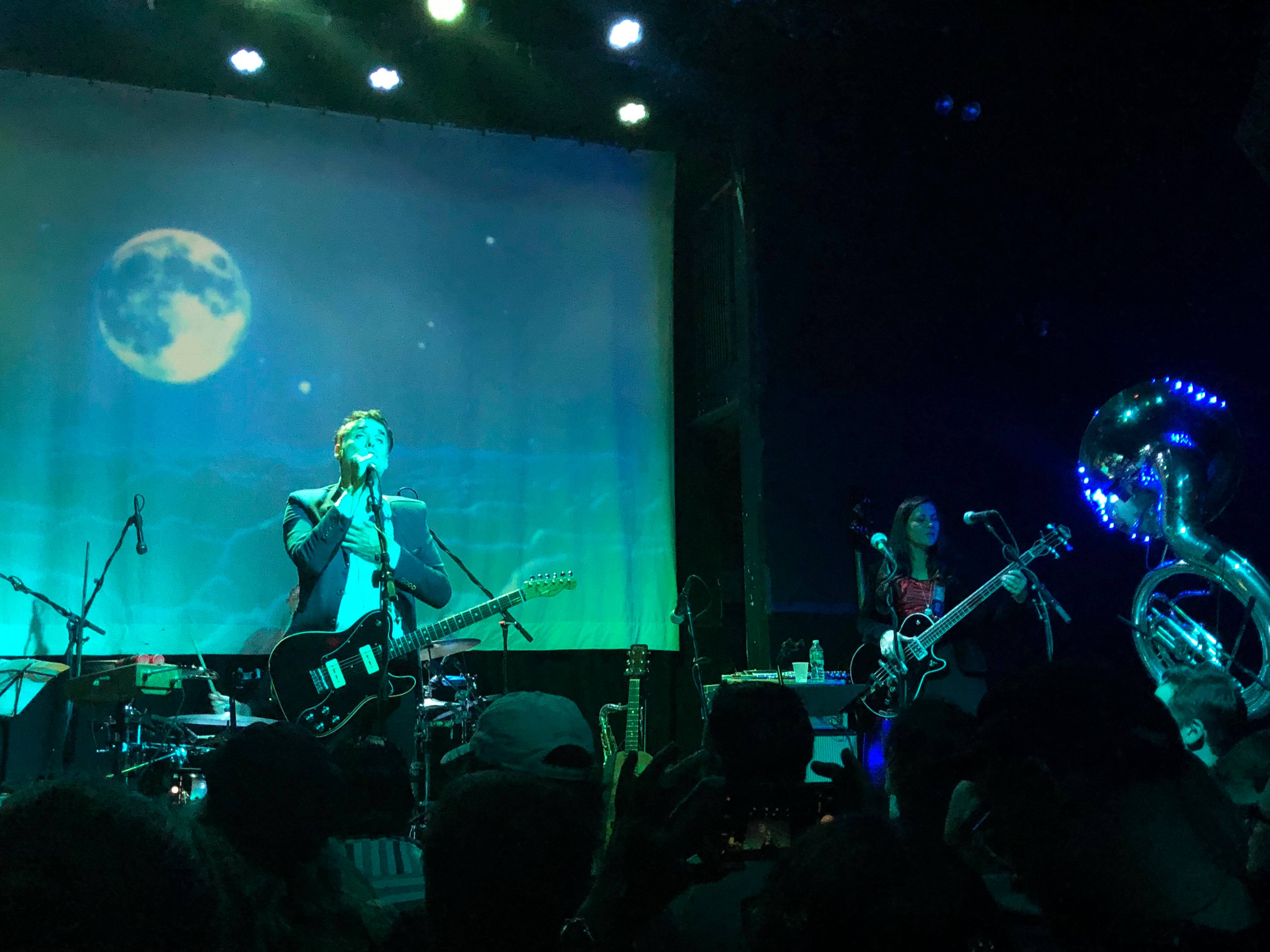 Jazz saxophonist and flautist Jessica Lurie also joined the band for a handful of songs. Jeanie Schroder had blue lights drawing eyes to her sousaphone, but portrayed her skills on upright and electric bass, as well as the flute (“How many shows do you get to see two flautists?” asks Urata, and I realize this is probably the only time I’ll ever experience that.) Tom Hagerman exercised his talents on accordion, violin, and piano. Urata, too, swapped instruments during the set, from guitar to theremin, even bringing out a bouzouki for the latter half. None of this outshone Shawn King’s resonant polka-like percussion. They chose to play with isolation of sound on both sides of the room, making the audience feel enveloped by sound.