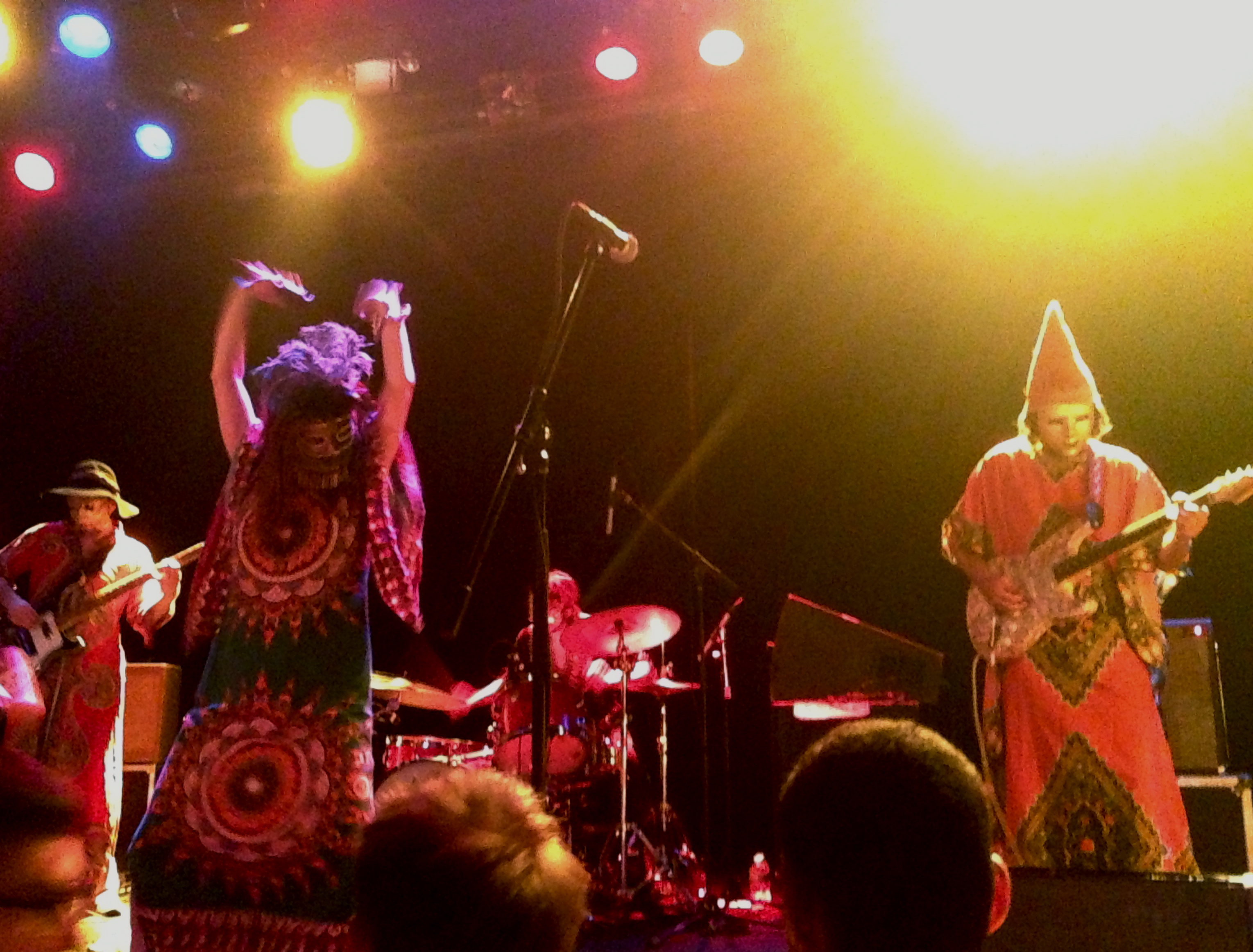 I was pretty excited to catch the act at Music Hall of Williamsburg; originally scheduled for Glasslands but moved to accommodate a larger crowd, the event promised to be at least mildly spectacular - it was the band's North American debut, after all. Two guitar players, a bass player, and two percussionists took the stage in outfits ranging from "creepy vintage clown marionette" to "gold-lamé clad fencing champion". At first, the vibe was actually pretty stoic, leaving me to wonder if the performance was going to amount to that of the animatronic characters at Chuck E. Cheese. But that vibe went from zero to sixty the second Goat's two female vocalists came on stage, gyrating, hopping, twirling, shaking tambourines and bells, chanting, and otherwise becoming the life of the bizarre psych Cirque du Soliel I was now witness to. If there's one thing I've learned from years of going to psych and noise shows, it's that no matter how long the recorded version of a song is already, it can always be longer, and Goat took the opportunity to extend the relatively succinct tracks on World Music into longform improvisations without alienating even one member of the audience or allowing for any stale moments.