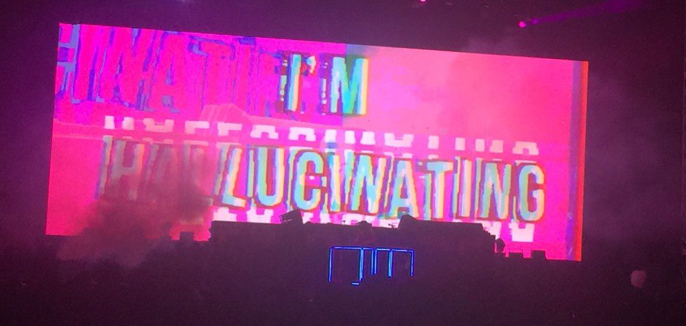 Later on, electropop artist Elohim took the stage for the trippiest set of the evening, with technicolor images of pills and the definition of "hallucination" on the screen behind her. It was during her act that the connection between EDM and psychonautic exploration was made clearest. In "Braindead," she sings about drugs and spirituality: "All I know is I know what I don't know / And what I don't know could fill up a whole bible." She also played an unexpected and musically fascinating cover of Harvey Danger's "Flagpole Sitta," her breathy voice gently drawing out lyrics punchingly shouted in the original.