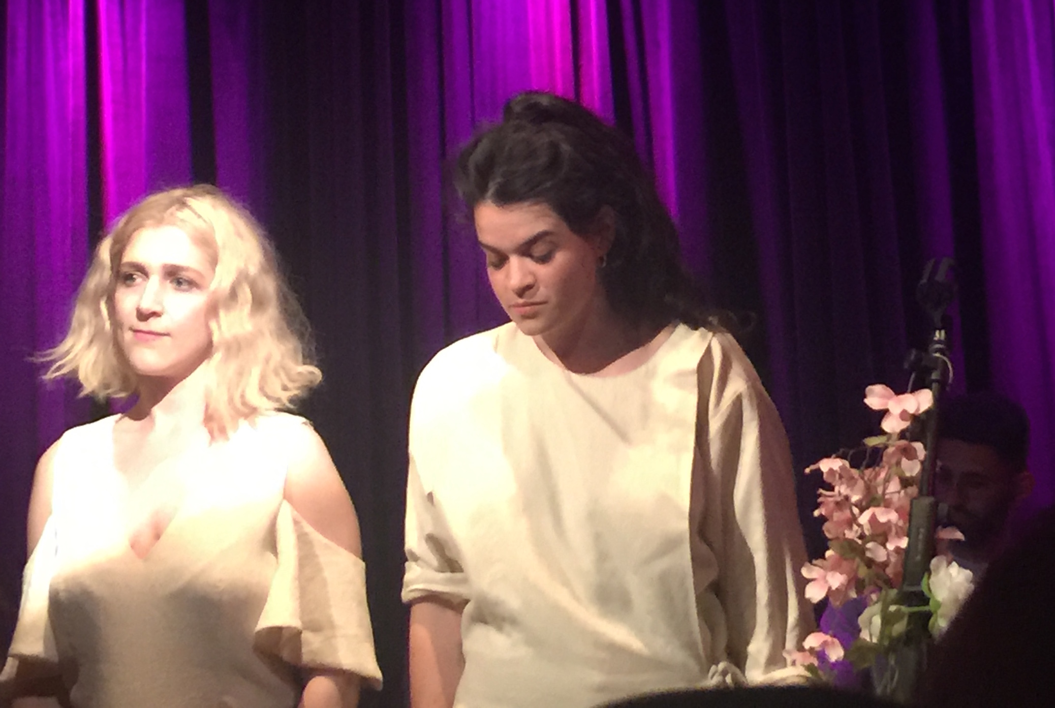 JJ Mitchell and Hana Elion hugged before beginning "Smaller Than My Mother" to wild applause. With a third member manning a drum machine and extra synths, they slowly swayed until the song's electronic beat began to pulse. Then, all at once, they busted out dancing like friends in a club (but like those cool, stylish clubbers everyone wants to be friends with). Mitchell, whose rich, soulful voice harmonized gorgeously with Elion's, ended the opening number with a wink.