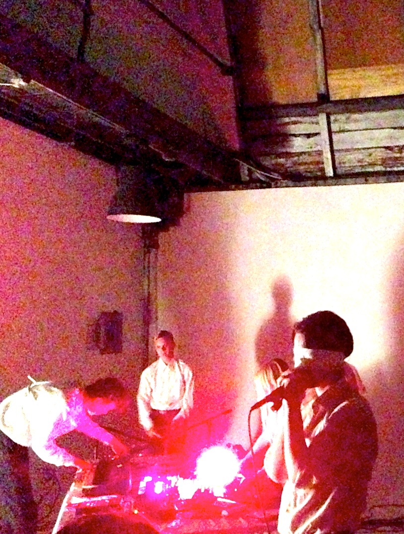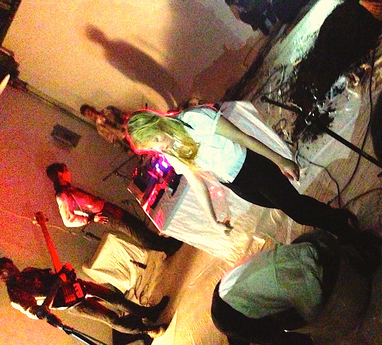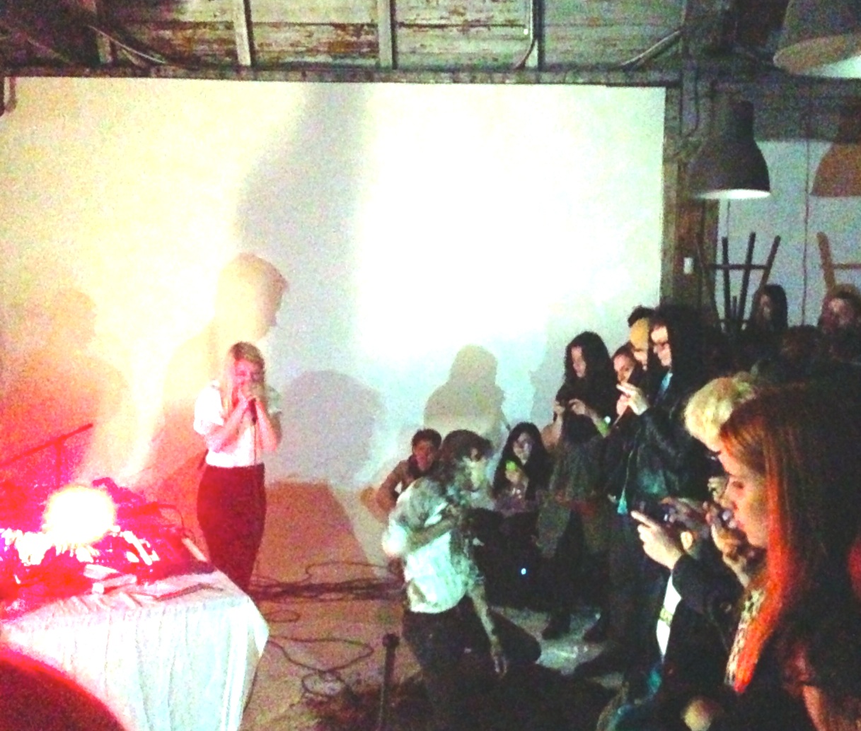 At the former (possibly current?) photo studio, there were no laser beams. Just a built-out loft with a sweep in one corner, covered in white plastic, Anthony Naples DJing remixes of the theme from Twin Peaks, a metal tub filled with water, and a pile of dirt. That was, until Pharmakon and Vår took the stage, together (billed cleverly as Vårmakon), just after 11PM. They wore matching white shirts and black pants that vaguely gave them the appearance of cater-waiters, but instead of rattling off the nightly specials with the skill of a Marlow & Sons pro, they hunched morbidly over a table of gear illuminated by red spotlights and took turns playing each others songs, each seamlessly blended into the next.