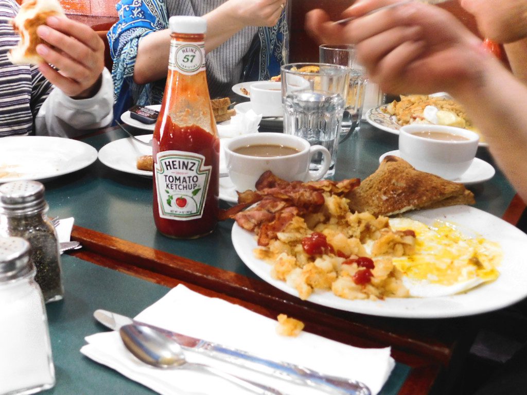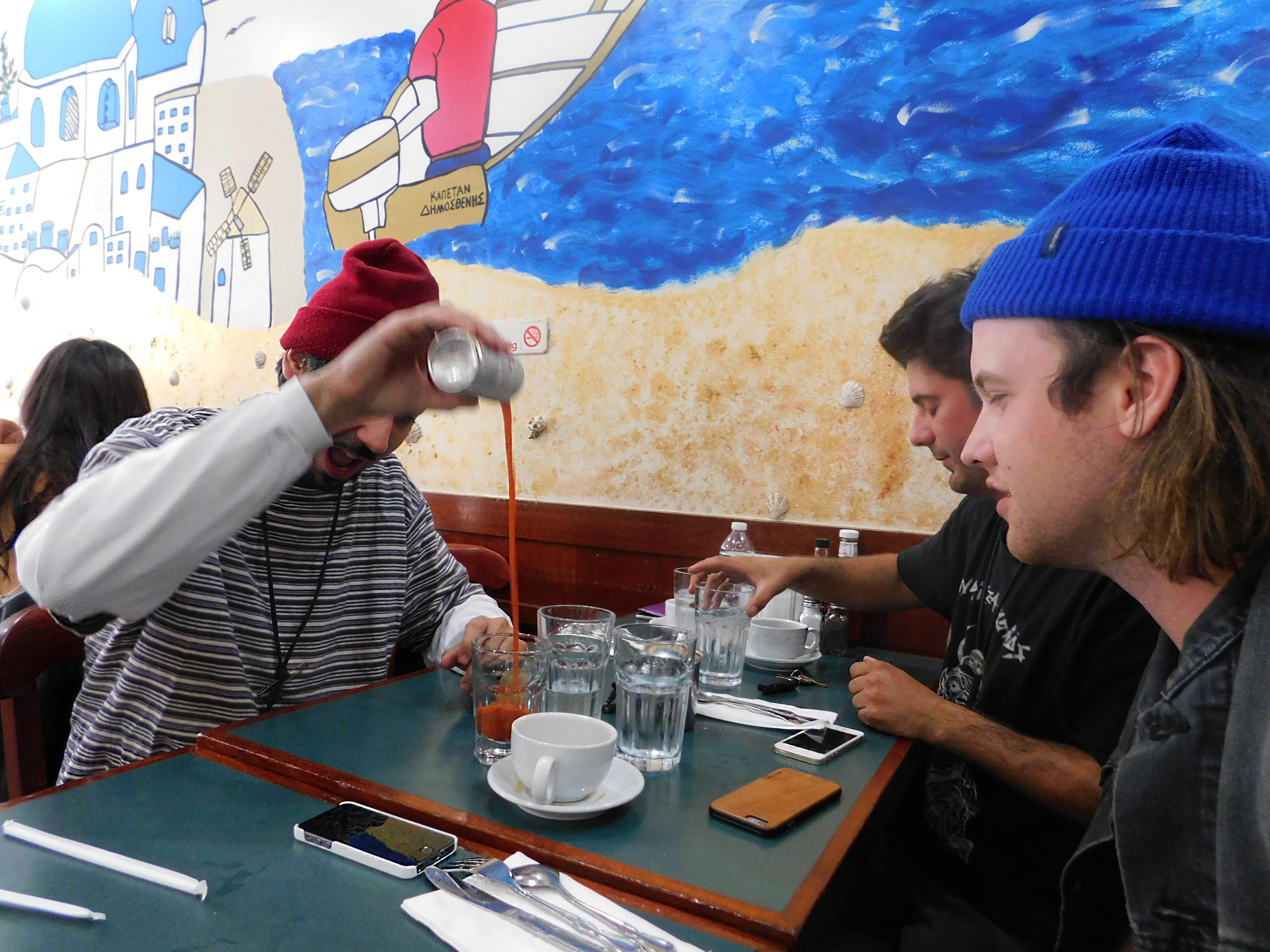 The Scene: The crew allowed me to pick our breakfast place, and it was a real Sophie's choice between "the diner next to my apartment" and "the diner next to the G train." I opted for the latter, mainly because I have to bounce to Penn Station to make it to Jersey for Easter. But diner-ing was entirely necessary, and everyone feels very welcome at Manhattan Three Decker, the Mediterranean mural besides us a reminder of our shoreside routes. 11:11 This feeling of belonging is immediately followed by everyone being seriously disappointed in me. "Mary Grace, Pat says there's no booze here," Sean says. I mumble something about how I think there's mimosas although now I'm wondering if I dreamed that up. Matt's V8 juice arrives and he empties it with a manic glee. They want to make sure that V8 gets an endorsement, so this article is brought to you by V8 and by JD Powers and Associates. "This article is going to be a V8 sponsored post," I promise. "I mean we have endorsements across the board," Sean says. "We should get Nascar jackets with all our sponsorships," David adds. Matt's now pouring hot sauce into his cup, which apparently makes the difference. Sean and David are adamant about adding butter to it. "Rich makes coffee and he adds butter and coconut oil," Sean explains. "It tasted like we were drinking butter. And it was a French press, so it was really strong coffee." "What is a French press, anyway?" I ask. "It’s like this..." Sean gestures wildly. "Kind of like this but a little bigger..." David also mimes the coffee-making mechanics. Melissa has a more coherent explanation. "It’s like you have tea, but you put in the coffee, it’s the same thing where you’re like, pushing the grinds down." The bottom line is, everyone's about this weird, fancy machine. "Once you start French pressing..." Melissa starts. "...you can't go back." David finishes. 11:23 Shout-out to Mustache's Bill's. Sean is trying to tell me, "We all worked at this diner—" "I didn't work there." "I didn't work there." "I didn't work there but I'm sure it's great." David, Matt, and myself gang up on that statement real quick. "Me, Pat, and Bongi worked there," Sean confirms. "Our boss has complained about being abducted by aliens twice. He’s our biggest fan." Incidentally, Pat isn't just working at Mustache's Bill's anymore. Not only is he really embracing his role as a frontman now that he's not tethered to his drum kit, he's also working as an insurance salesman, which means he now brings business suits into his stage attire. Last night, he added a cowboy hat to the ensemble (Melissa has the pictures). Again, I'm delighted.