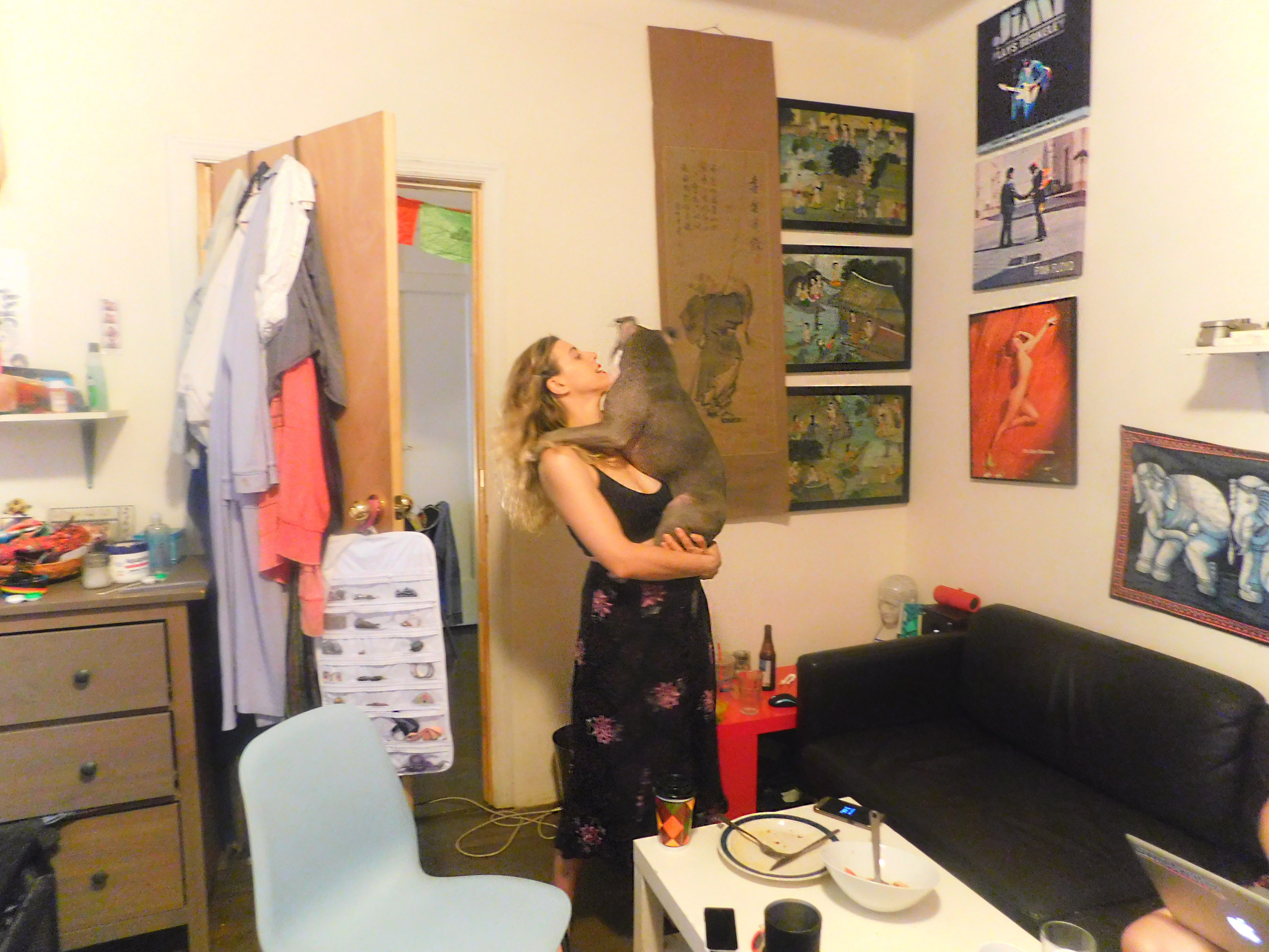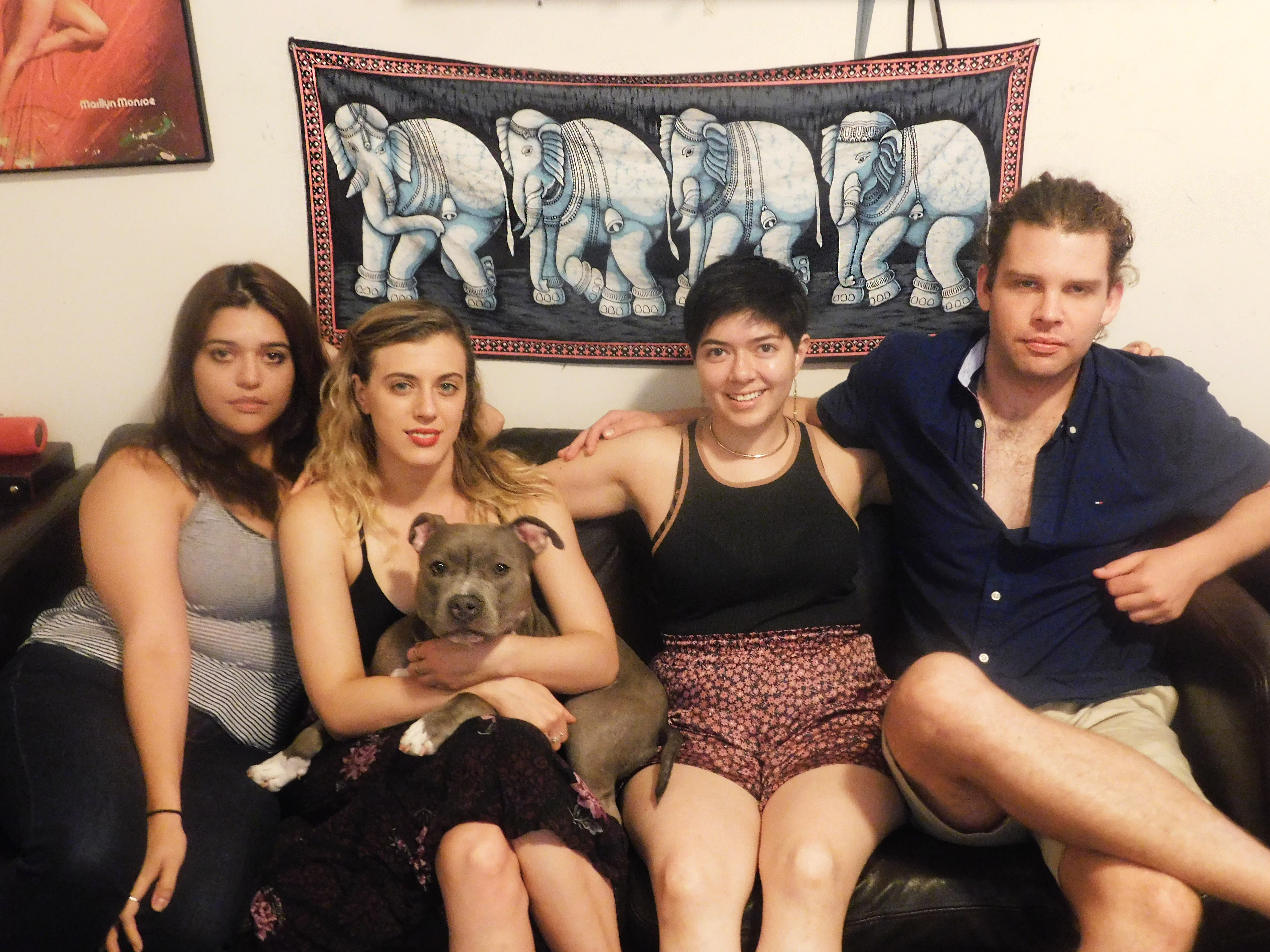 So that's why we're in Mason and Evan's kitchen in Flatbush, their precious pitbull Honey at our feet. "Mel, Mason and I went to a party last night and we got home at 2:30 and we were like, 'Oh, let’s play some tunes...'” Evan says, before we cheers.