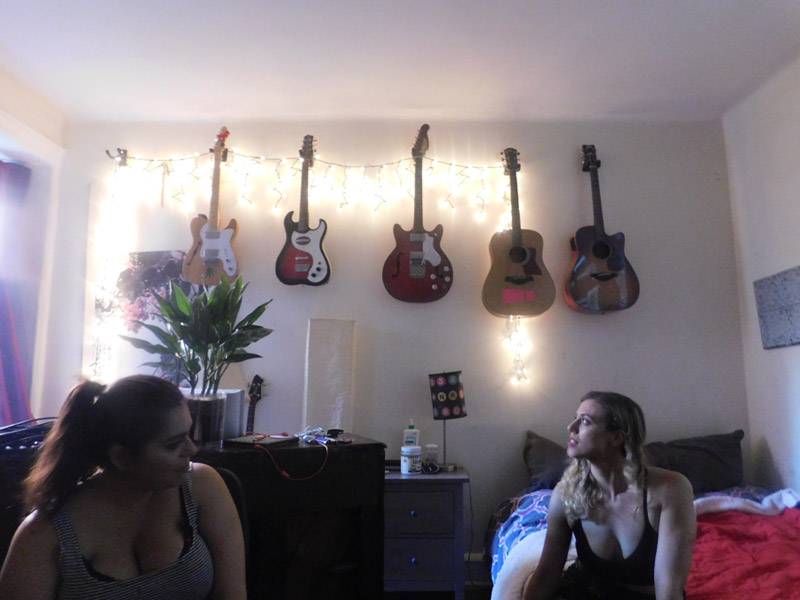 2:24 We move into Evan and Mason's room/practice space, hence the wall of guitars and literal piano near the window. The girls and I waste no time devouring Evan's breakfast: chicken sausage, sliced peaches, French toast and eggs on the way. "You know what’s really funny? Ev is a vegetarian," Mel says, but clearly one who can make a boss chicken sausage.