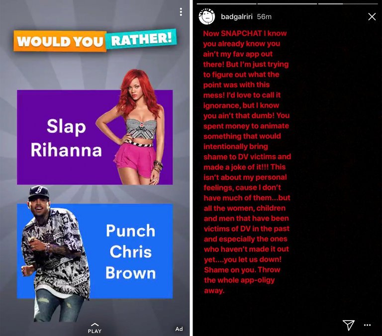 Rihanna has publicly accused Snapchat of victim shaming after the social media app displayed an advertisement the referenced Chris Brown’s 2009 brutal assault of the mega-star. The ad, for online game, “Would You Rather?!” makes light of domestic abuse by asking viewers if they would choose to “Slap Rihanna” or “Punch Chris Brown?” After fans pointed out the despicable ad spot Rihanna used major Snapchat competitor, Instagram, to make a statement, posting: