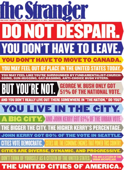 This was a portion of the cover Seattle’s culture rag The Stranger ran in November 2004 when George W. Bush was reelected. I remember it well. I remember it well, in part, because that cover page has been framed and hung on the wall of my sister’s house since. The remainder of the text encourages Seattleites by reminding them “Kerry got 61% of the urban vote…got 80% of the vote in Seattle,” essentially praising the power of the “urban archipelago,” which some might consider a flaccid pat on its own back. A warm glass of milk while the world burned.