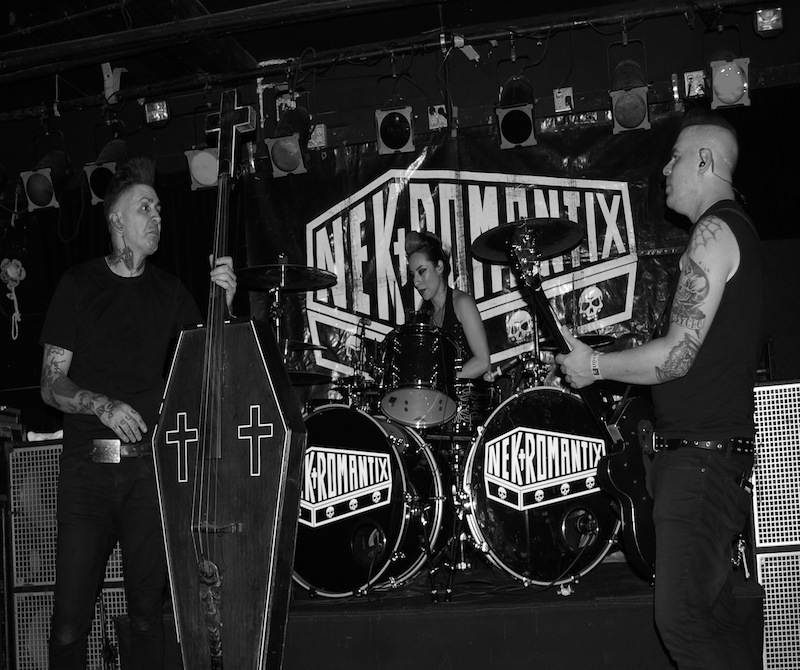 A large portion of the set is blurry to me, perhaps because the air itself was blurred by all that smoke. Or it could have been the impromptu bloody nose that was summoned by the dryness in the room (this was a great thing because all of the girls in the bathroom assumed I’d been punched). But I sharply remember the moment Nekromantix took stage, all armed with instruments like I’d never seen. Frontman Kim Nekroman’s upright bass was an enormous coffin crowned with a cross headstock. I remember how menacing they seemed to me at the time, singing freely of murdering cheerleaders, necrophilia, and the underground muse to many artists, Bela Lugosi.