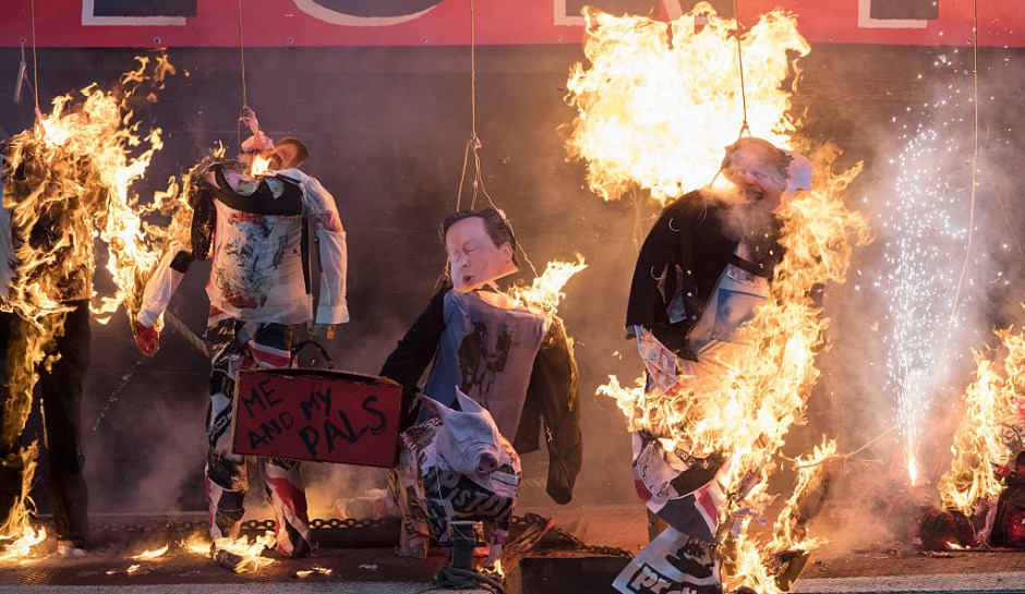 I wasn’t sure if Corré, who is also the founder of exorbitant lingerie brand Agent Provocateur, would follow through with the burning. It was doubtless a publicity stunt, but would the match be struck? Apparently so. While we were still trippin’ on tryptophan this past Saturday, Corré, who hired a PR firm promote the event, took to the River Thames with Westwood in tow and burned the artifacts on a boat; complete with flaming effigies of David Cameron, Theresa May, etc. Flames engulfed everything from rare Sex Pistols recordings, punk-era merchandise, and clothing that belonged to Corré’s famous parents. The date, November 26th, marked the 40th anniversary of the Sex Pistols single “Anarchy in the UK,” which is super hilarious because I imagine Corré must have had to get a permit to set fire to things on a boat in the fucking Thames river. Or maybe he just paid the relatively small fine of 5,000 pounds to get out of trouble. That must be chump-change for a man with millions of pounds to actually burn.