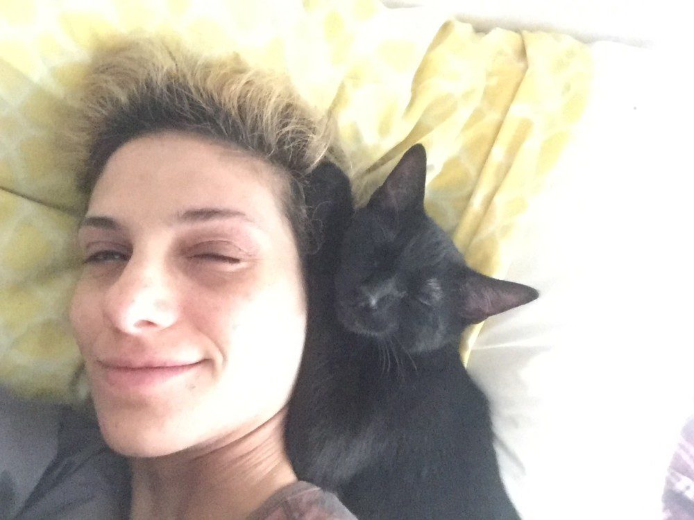 AB: Tim [of Big Bliss] and I went to an adoption event in Union Square, flirting with the idea of adopting a cat. It was set up like a green market, except instead of fruit and vegetable stands there were rows and rows of stands from different pet adoption agencies, each with kittens and/or puppies. It was an unseasonably balmy day in September, and the animals were in cramped cages, in close quarters, in a very noisy, hot, and stressful place, getting poked and prodded. Most of the cats were VERY grumpy, understandably so. We walked around and held our hands out to kitties to sniff to try to make friends, but most of them just wanted to be left alone. When we came over to Bruce's cage and I held out my hand, he sauntered right over and put his little paw in my palm. And then he did the same with Tim. We fell in love right away. He was the chillest little dude, totally unbothered, with such a sweet temperament. Also, Tim's all-time favorite superhero is Batman, and Bruce, then named "Midnight," had "I am the night, I am Batman" on the back of his name tag. We took it as a sign. (And then after some deliberation renamed him Bruce after Bruce Wayne.)
