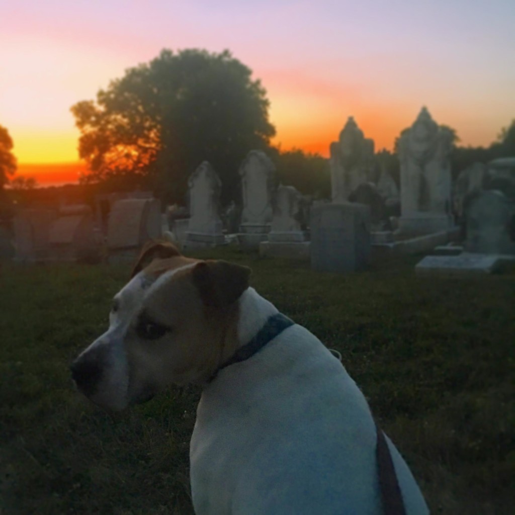 Buster enjoying the sunset at a cemetery screening of The Craft.