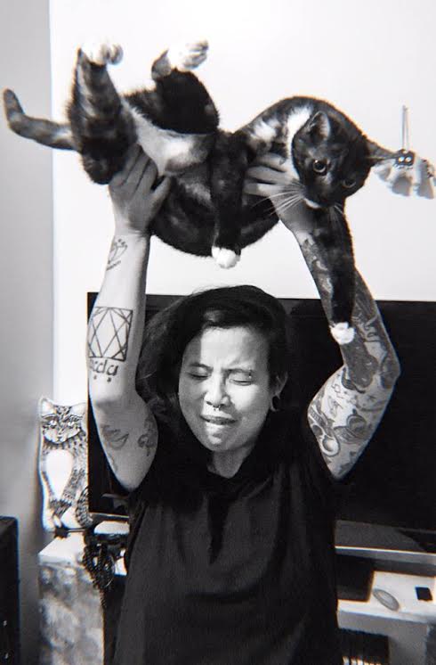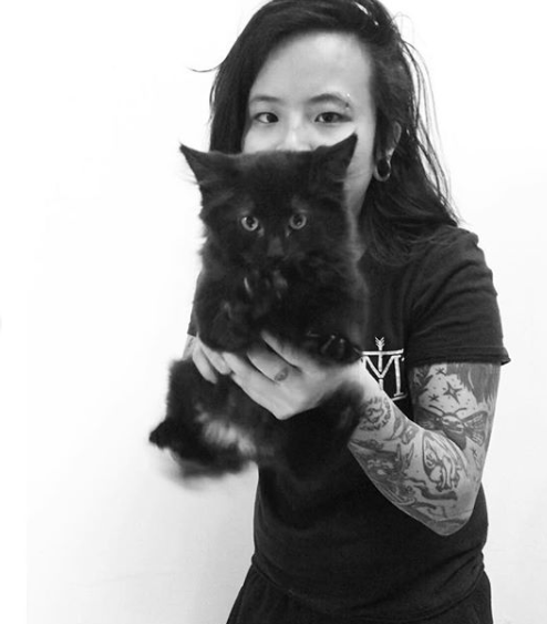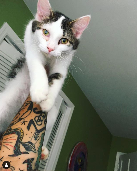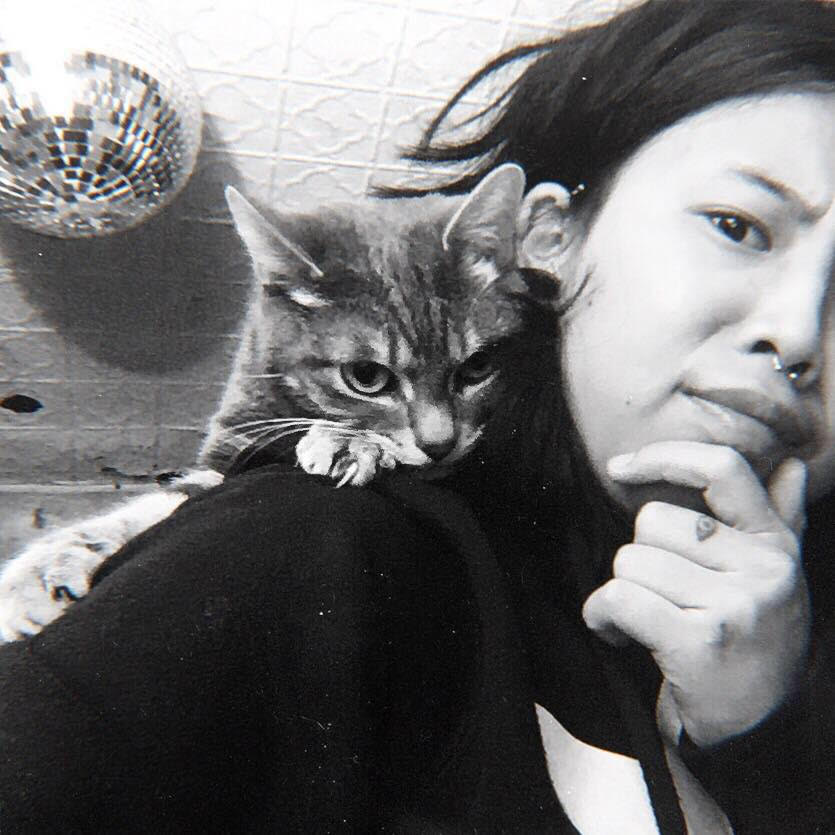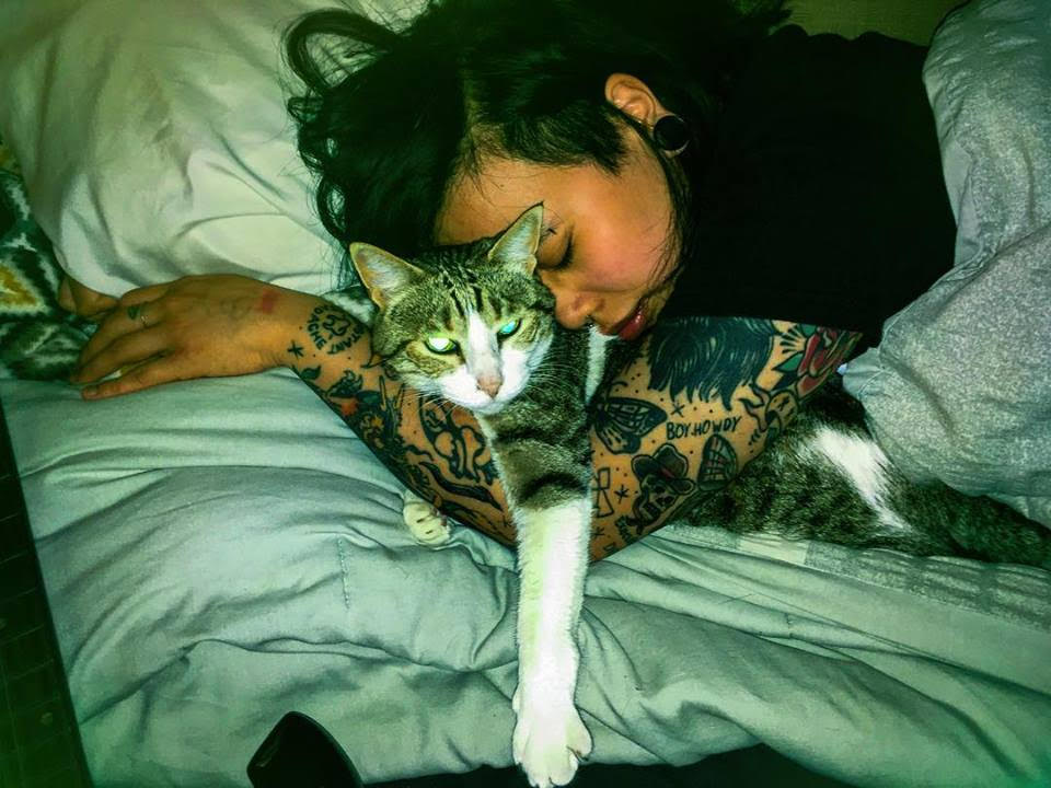 Sundance Kidd shreds on guitar, bass, and the mic. Ze never misses a note on guitar and seems to automatically learn any song by ear. You may have seen them in a whole slew of Brooklyn’s rock bands as of late, such as Gesserit and Darkwing. Ze has also made numerous guest pop-up guest appearances singing in bands like Whiner, Halloween cover sets, Lost Boy ?, and Gustaf. You’re just as likely to see Sundance Kidd behind the camera, capturing the many action-packed moments in a live set: musicians carrying each other on their shoulders, diving off stage, rolling around through beer drenched cables, or perfectly posing for press shots. This past fall, Sundance Kidd hosted a photography show at Two Boots Pizza Williamsburg, displaying some of these raucous photographs in order to raise money for The Russel Efros Foundation to support cinematography and photography students at SVA. In their spare time, Sundance Kidd has another passion: cats. Though ze isn’t currently a pet parent, ze gets their feline fix in caring for fellow Brooklyn musicians’ cats. I present to you Brooklyn’s Rock N’ Roll Catsitter.