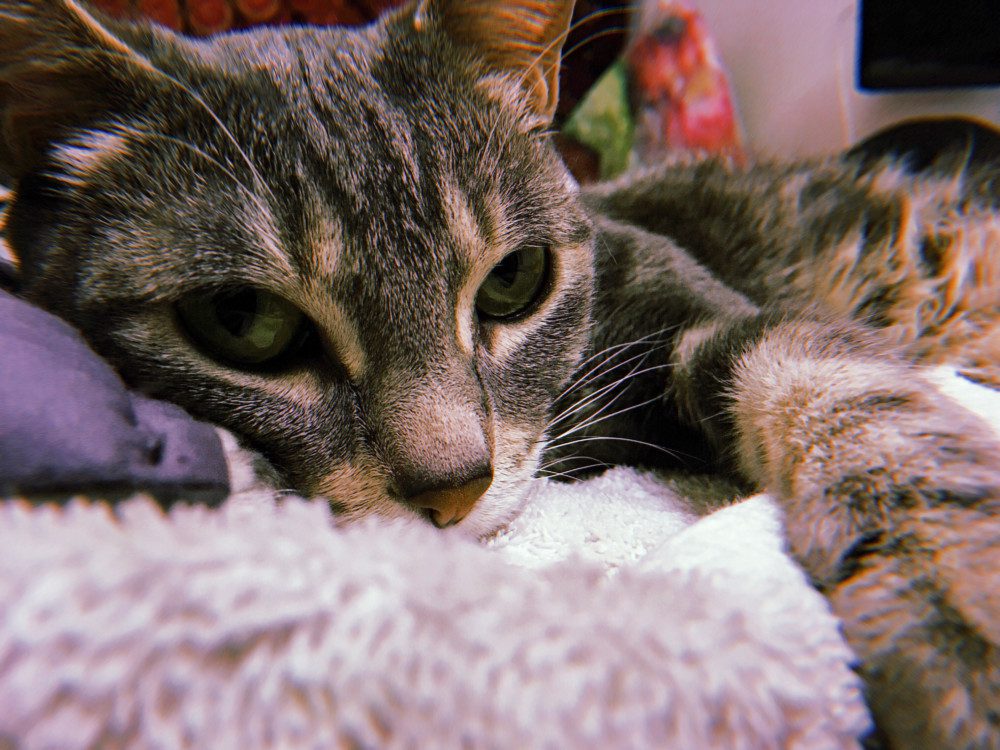 SK: Baby Burger is forever a youthful kitten! She is extremely affectionate and very vocal. She is a very good listener and usually will talk back to you. She loves to be held and cuddled which is why she is my favorite cat to sit for. She also is a total HAM for photos and poses for you!