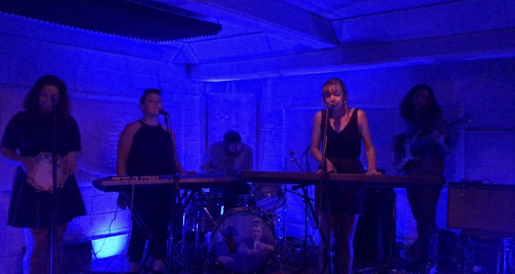 I walked into the basement of the Blockhouse just in time for the psychedelic dream pop stylings of LadyCop. LadyCop is an eight person project headed by Chelsea Sherman (vocals, keys, synth, percussion) and is comprised of Alex Arnold (guitar, bass, synth, percussion), Kenzie Main (vocals), Biz Strother (vocals), Jonathon Brunnes (bass), Josh Morrow (drums), Charles Roldan (drums) and Patrick Hitchings (violins). While not all eight member of the project were present at this live show, a fullness in sound was provided by the three-part vocal harmonies, one of the core identifying features of Ladycop's sound.