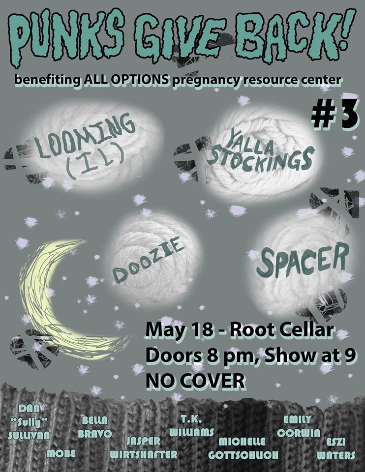 Punks Give Back! Bloomington is a local branch of Punks Give Back!, a national, not-for-profit organization that supports local artists and organizers to raise money for local nonprofit organizations. Punks Give Back! Bloomington organizes a monthly event with music and poetry in order to channel funds into various organizations that support local underserved and underprivileged populations. On March 4, this organization’s first event raised money in support of the UndocuHoosier’s fund. UndocuHoosier Alliance is a group that serves the needs of undocumented people at Indiana University and in Bloomington. The second event, held after Bloomington’s Zinefest, raised funds for the Bloomington Anarchist Black Cross and local prisoner support efforts. On Thursday, I caught Punks Give Back No. 3, a benefit show for the All-Options Pregnancy Resource Center in Bloomington. This center provides a number of services to people in the community: free pregnancy tests, peer counseling, diapers and baby clothes, abortion funding, condoms, adoption information, support groups, and referrals.