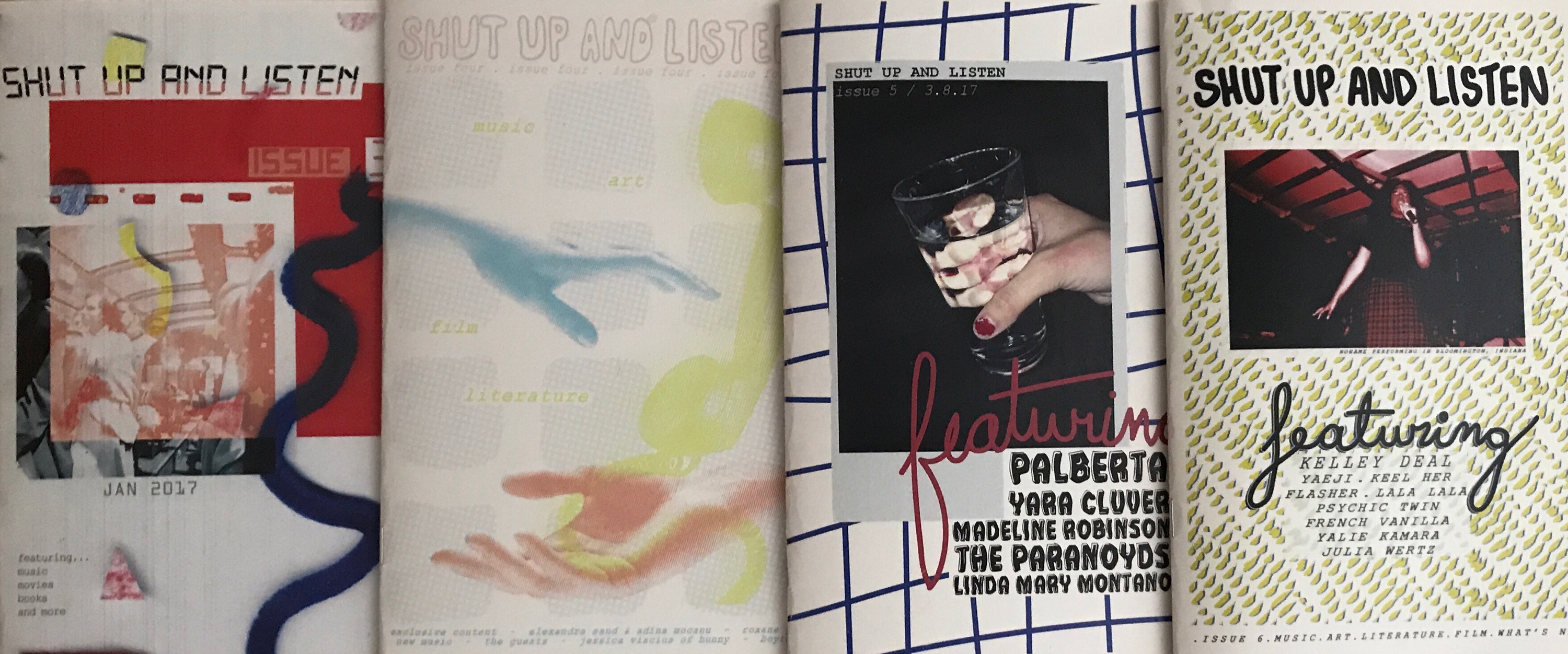 Shut up and Listen is a serial zine based out of Bloomington, Indiana that focuses on the (mostly local) underground music scene. Jessie Grubb and Bethany Lumsdaine are the creative partners and best friends behind the zine and radio show under the same name. Grubb and Lumsdaine have been self publishing and distributing Shut up and Listen almost monthly since October, cobbling together an eclectic mix of reflections on the local scene, interviews with touring and local artists, music recommendations, and event information that have been thoughtfully curated and compellingly written. Each issue of Shut up and Listen features bright and colorful cover designs and artist illustrations that both stand out on their own and solidify a cohesive aesthetic across all six (and growing) issues. Last week, I got the chance to chat with Jessie Grubb and Bethany Lumsdaine. We talked music, the local scene, and the future of Shut up and Listen.