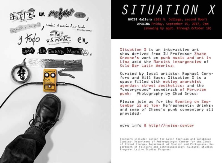 As a professor of anthropology at Indiana University, Dr. Shane Greene's focus on Latin American and Caribbean Studies brought him to an unexpected area of research: the various underground punk movements of Peru. For American and UK audiences, punk symbolized rebellion through aggressive music and extreme fashion, but in 1980's Peru, intense political upheaval and decades of bloody conflict made its underground punk scene frontline commentators on a volatile civil war, the symbolism in its militant message dissolving into one of subversive reality and responsibility. Situation X, a new interactive art show curated by NOISE Gallery founders and local artists Raphael Cornford and Bill Bass, is based on Greene's book Punk and Revolution: 7 More Interpretations of Peruvian Reality and centers on Lima’s rock subterráneo during the 1980s Marxist insurgencies in Peru, the Maoist Sendero Luminoso (Shining Path) and the Movimiento Revolucionario Tupac Amaru (Tupac Amaru Revolutionary Movement).