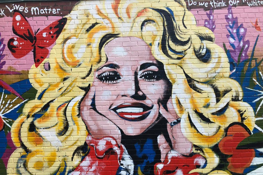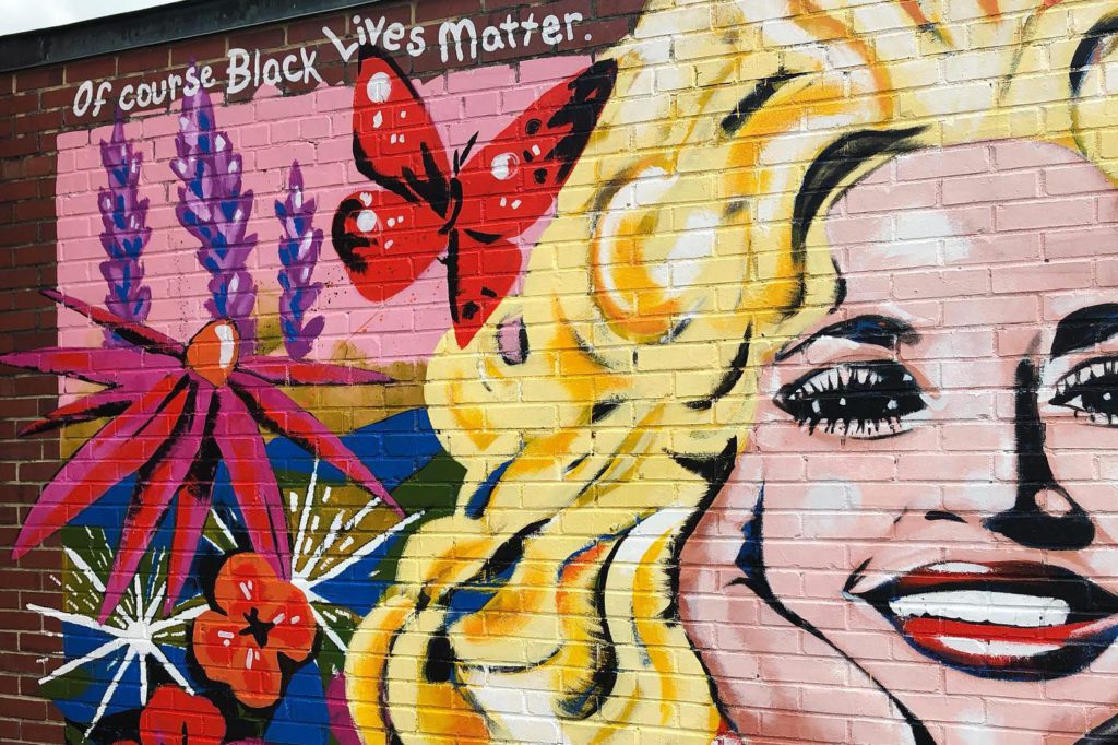 After connecting with the owners of The 5 Spot in East Nashville, she put paint to brick. But just before Radford was done with the piece, Parton's Billboard interview made waves when she was quoted as saying, "I understand people having to make themselves known and felt and seen. And of course Black lives matter. Do we think our little white asses are the only ones that matter? No!" The quote quickly went viral, compelling Radford to weave the words into the massive painting that shows a beaming, bright-eyed and big-haired young Dolly surrounded by butterflies and flowers.