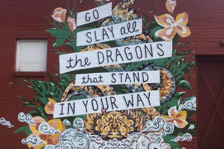 The couple is now based in Nashville, and Radford often gets referrals for work through her husband, including a commission from Americana band Drew Holcomb and the Neighbors. Holcomb called on Radford to paint a mural based on encouraging lyrics from the title track of their 2019 album Dragons: “Go slay all the dragons that stand in your way.” Radford turned these words it into an eye-catching visual of a golden mythical creature with white smoke pouring out of its nostrils, almost as if onto the street. The larger-than-life painting has stopped passersby in their tracks, many posing for photos with it, accompanied by such hashtags as #goslaytheweek.