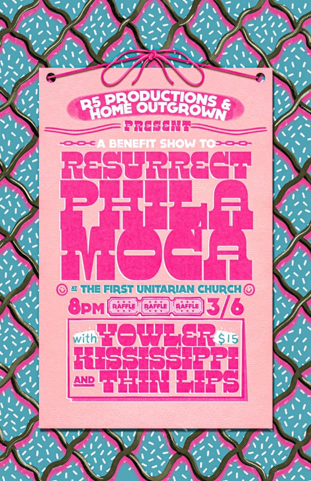 To help raise the last bit of money needed to re-open PhilaMOCA, local promoters Home Outgrown and R5 Productions threw a benefit show, which was fittingly hosted at the all-ages First Unitarian Church (yes, it really is a church). Philly favorites Yowler, Kississippi, and Thin Lips united to form a stacked bill, and locals like Mannequin Pussy, Frances Quinlan, and Algernon Cadwallader donated records and merch for a raffle.