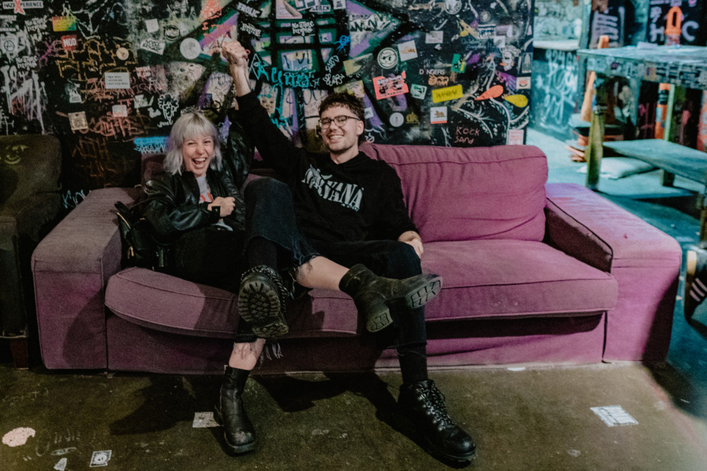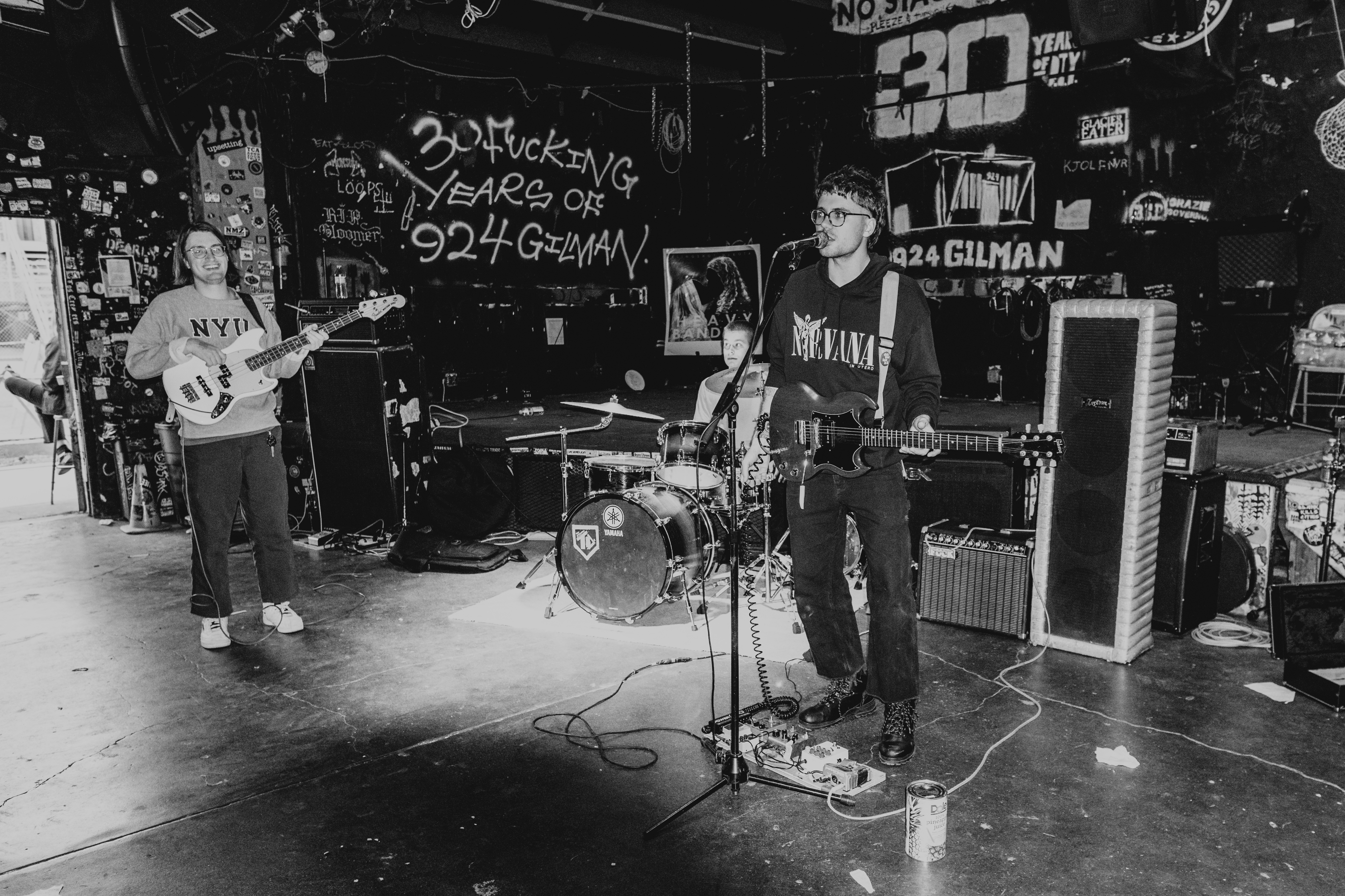 924 Gilman is the perfect place to observe the effects of such a transition. Its walls are graffitied and stickered down to the minute inch, the performance floor edged with ratty couches and chairs. I sat through most of the show, bookended by three younger boys, one of whom was wearing noise-dampening earphones.
