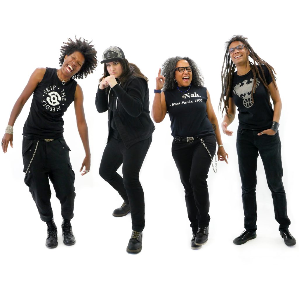 Do what the cops say/don’t talk, don’t think, don’t fight, don’t feel! serves as the pre-chorus, leading us to a final we ain’t never going back call-and-response punctuated by the very old-school rock posturing of the band, seen in full glory in a video of their performance at the El Rio bar in San Francisco. As drummer Kofy Brown snarls into the mic and guitarist Shelley Doty whips her dreads in tandem with the beat, guitarist Katie Cash tips her chin to the sky before exchanging a look with Randal, a millisecond of pause before they gather the energy to end the thing on Randal’s backbend, clapping and cheering more for each other than for themselves.`