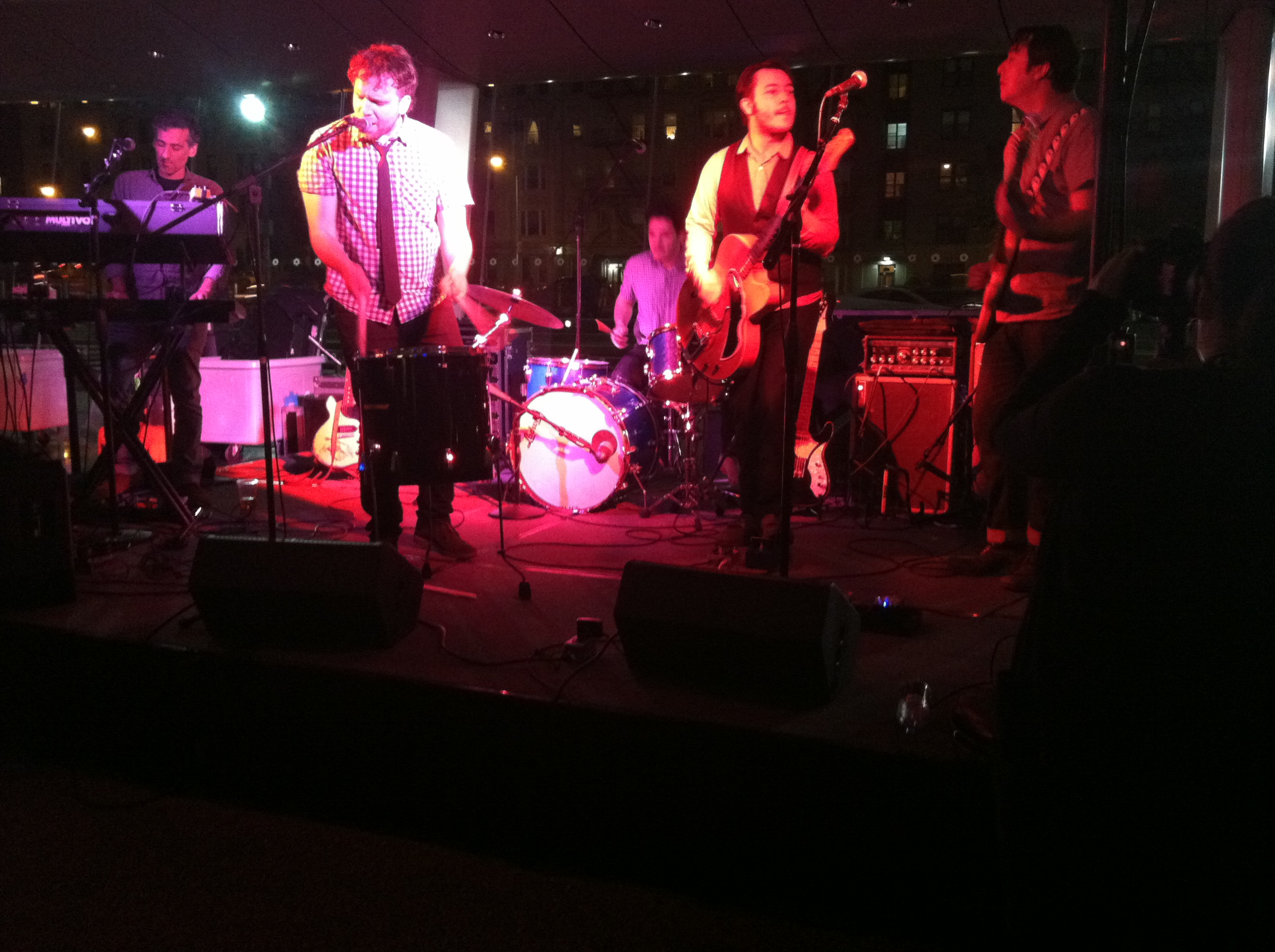 By the time Caveman took the stage the sun had gone down, the night falling like a curtain behind the performers, their shimmering brand of psych pop sounding like it could have been played by the dancing reflections on the glass as opposed to the real, live band before it. Despite their rough and prehistoric sounding name, these five guys mostly wore button ups and were more clean-shaven than I'd hoped they'd be, but their set was totally rewarding otherwise. Unlike so many bands that come from elsewhere to Brooklyn to make a name for themselves, several of Caveman's members actually grew up here, and given the setting, lead vocalist Matthew Iwanusa was really stoked on reminiscing about the days when he was meeting guitarist Jimmy Carbonetti in school. Standouts “Old Friend” “Decide” and “A Country's King of Dreams” from 2011's Coco Beware rolled over marble floors bounced through columns and rolled around steel beams like a one of those gargantuan prehistoric serpents. They also debuted some great new material. Iwanusa employed the use of a floor tom, front and center stage, to punctuate rollicking choruses with next-level immediacy, never replacing the rhythms of Stefan Marolachakis' drumming behind him but accentuating certain passages, catapulting the songs into a different realm. While Caveman's sounds are not new territory, they are skillfully pulled off with an enthusiasm and authenticity that's hard to come by, and there's a level of artistry that goes on behind the scenes; Carbonetti makes all the bands guitars. They're playing several shows in Brooklyn over the next few months and are definitely worth checking out.