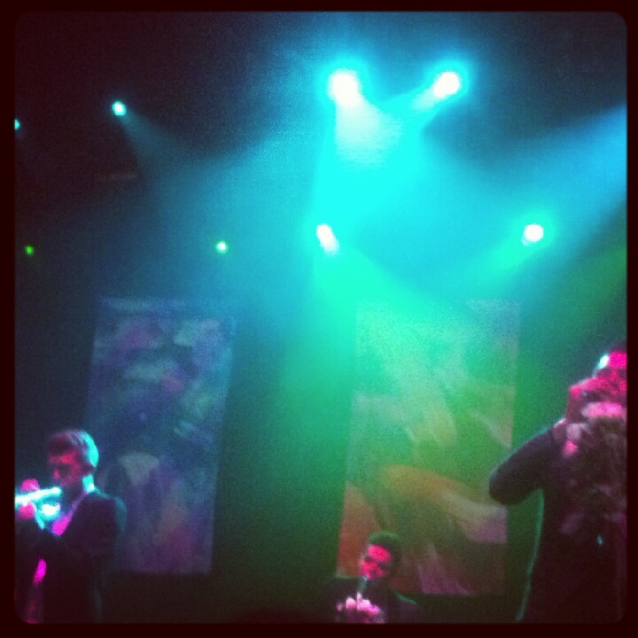The stage looked beautiful. Bouquets of white roses embellished every mic stand. Massive banners in the style of abstract expressionism, of Dears most recent album artwork (created by Ghostly’s resident graphic designer, Michael Cina) hung in the background. Each band member juxtaposed one another dramatically, with two sets of percussion sidling the back, the trumpet player front and center, and the bass player in between him and Dear, who, off to the side, performed the electronics, lead guitar and vocals, conducting it all like a circus master. Everyone wore really pretty outfits. They started playing—new and old songs, all of which are so incredibly good— and the audience gravitated toward them like moths to a flame. It felt par for the course.