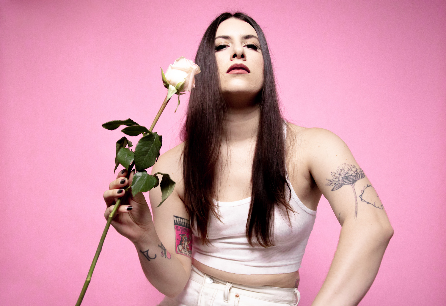 Directed by her partner Matt Speno and filmed in her old living room with help from Zeno Pittarelli and Alice Osbourne, the music video for "Secret Crush" finds That Brunette drenched in a romantic pink, acting out her "quippy and cheeky" lyrics through kitschy literal interpretations. Her strong visual eye and penchant for aesthetics are effortlessly genuine; she styled herself in a classic white-on-white look she describes as "clean, approachable, and authentic...a look I would wear in the summer to a gay bar."