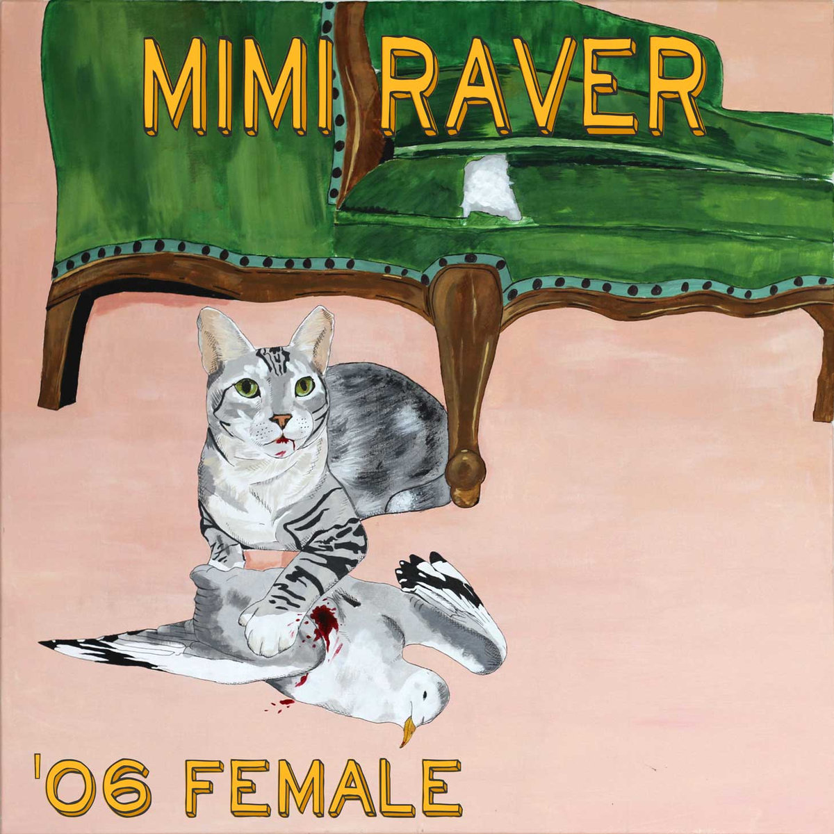 The album art for Mimi Raver’s upcoming LP ’06 Female will give you an insight into the songwriter’s knack for duality. At first glance, the cover for Raver’s imminent release bears the precious, painterly image of a grey tabby, sitting pretty by a Kelly green couch. On closer inspection: droplets of blood color the cat’s mouth...and then you see the dead seagull, punctured and pinned between kitty’s paws.