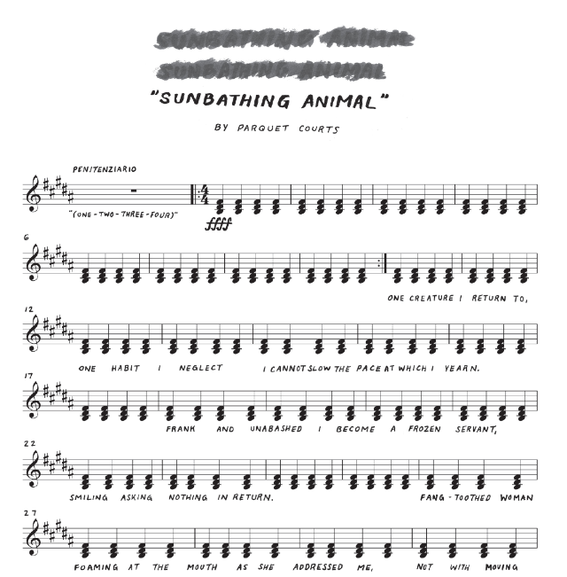 The group came crashing into mainstream view with Light Up Gold at the end of 2012, and then proceeded to have a busier year than their dope-smoking, couch-crashing, afternoon-rising music might have made you think was possible: they toured extensively in 2013 and released their Tally All The Things That You Broke EP less than a year after the full-length dropped. On June 3rd, Brooklyn’s hardest-working slackers are back with a brand new record titled Sunbathing Animal. Early in March, Parquet Courts came out with the title track off the new album--but only on sheet music. The dynamics prescribed for the song? “ffff,” aka “loud as hell.” Indeed.