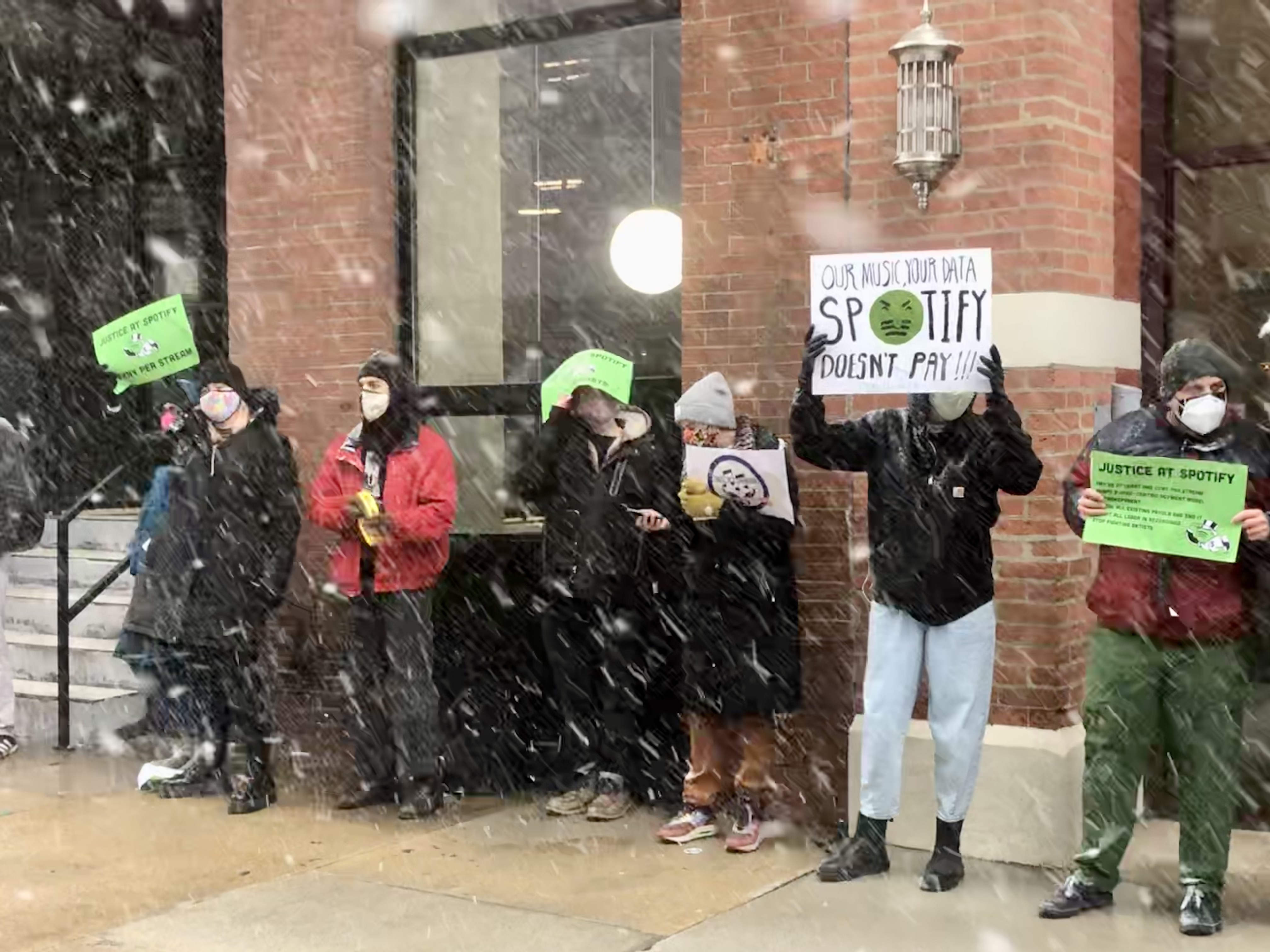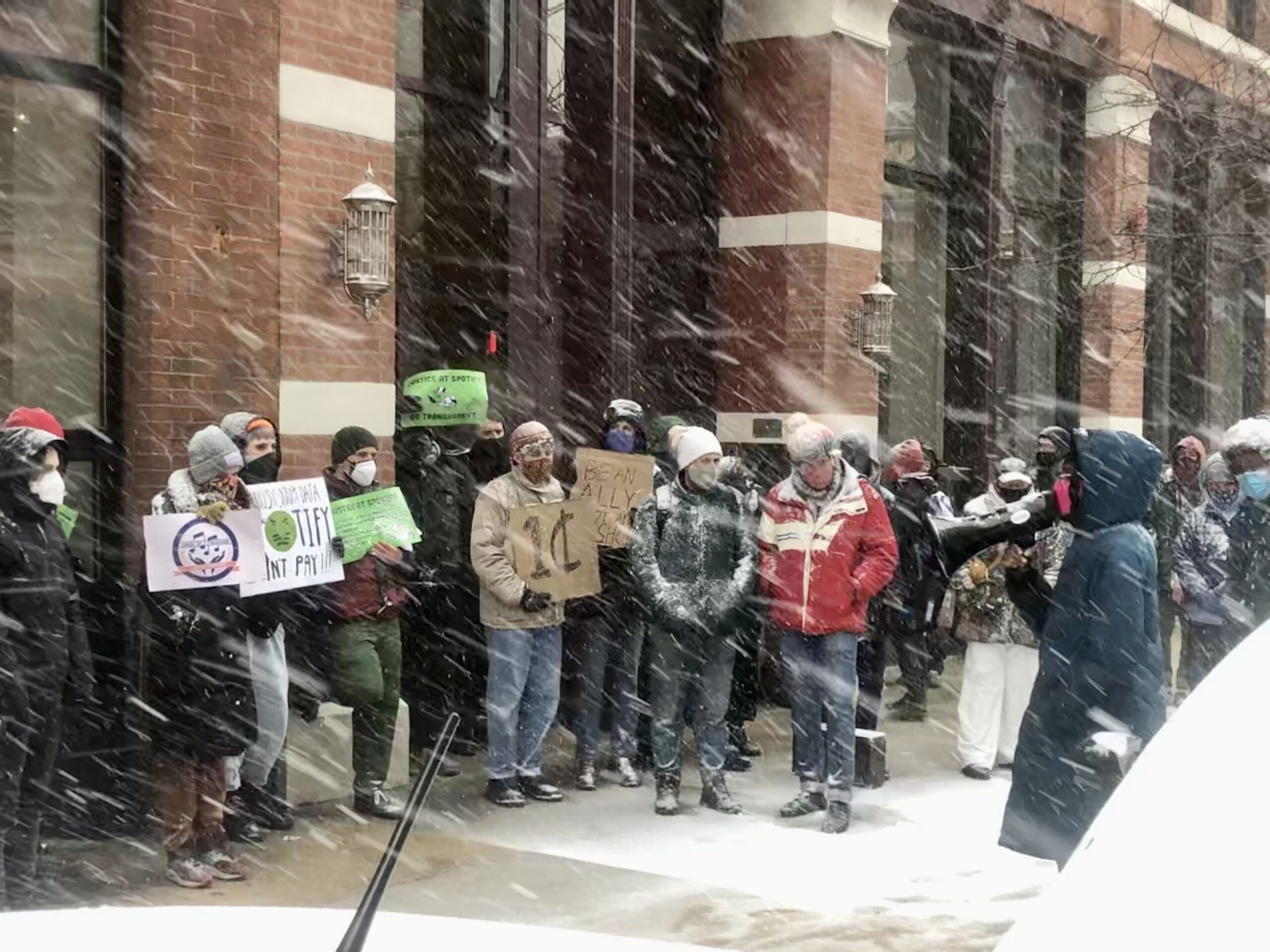 That was just one of the slogans chanted by dozens of musicians and supporters outside of Spotify’s Chicago offices on Monday, March 15. Organized by the Union of Musicians and Allied Workers, Justice at Spotify was an hour-long demonstration calling for the streaming giant to pay artists a penny-per-stream, among other demands and material interests, to help build more sustainable, equitable, and inclusive music communities.