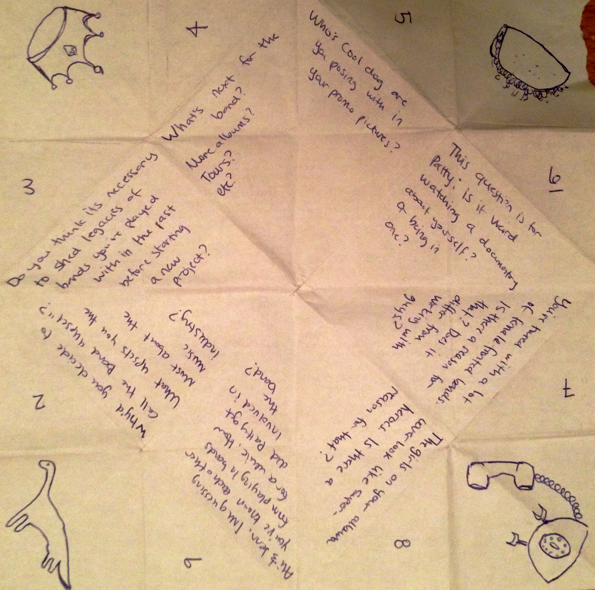 At the second night of a three-part Don Giovanni showcase last Friday, we caught up with three of the New Brunswick-based punk label's brightest and best. We also decided to pioneer a new interviewing technique based on a popular children's fortune telling game, using a folded paper "cootie-catcher" (or "saltcellar" or "chatterbox" or "whirlybird" or whatever you may have called it).